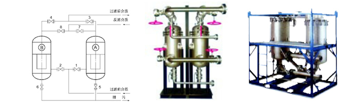 0.3~100 | ■SJFM—II型精細過濾器應用實例 一煉油行業:各類油品過濾,石蠟過濾; 一“三采”注聚裝置:聚合物過濾、水過濾 一化工行業:各類活性碳過濾、工業污水過濾、高溫氣體凈化 3、金屬粉末燒結濾芯精細過濾器SJFM—III型 SJFM-III型精細過濾器的核心是微孔粉末燒結管,具有耐高溫、耐腐蝕、孔徑均勻穩定、透氣性好、可清洗再生等特點。用于液體或氣體過濾。 SJFM-III型精細過濾器適用于過濾精度0.01—100 u m液體、氣體過濾。 SJFM-III型精細過濾器主要用于導熱油、液壓油過濾,無菌氣體制備。 4、精細過濾器并聯切換反沖洗過濾系統SJFM—D 本過濾系統由于采用可清洗再生的金屬濾芯作過濾元件,從而能夠實現系統長期平衡連續運行的目的。其操作方式有手動和PLC程控兩種。其基本工作原理如圖。