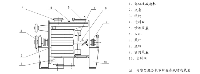 2980X2112X2333 | 說明:1、標準機型無夾套,無噴液裝置,如需要,訂貨時須說明 2、當物體比重p<0.6×103kg/m3時,每次投料量ω=ρ物×V機× 0.6(kg); 當物體LL重p≥0.6×103kg/m3時,每次投料量ω=600×V機×0.6(kg)
