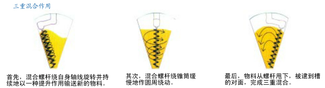 應用領域 一農業領域:農藥、化肥、飼料及各種添加劑生產中的混合。 一食品工業:小麥粉、谷物、奶粉、香料、咖啡、味精、食鹽等的混合物。 一干燥行業:粉料的干燥。 一化工工業:藥品、化妝品、洗滌劑、涂料、樹酯、玻璃硅、顏料、塑料、添加劑等行業的混合。 性能特點 一該機適用于固(粉)—固(粉)(粉體粒度300~2000um)混合及固(粉)—液(含液量<15%)的混合,特殊的夾套裝置,還可作為干燥設備使用。 一獨有的雙級雙軸輸出的減速機,使本機結構緊湊,外型美觀,操作方便; 一錐形簡體以恰到好處的錐度確保物料流動形式及方便迅速出料,無滯留; 一設備內部結構設計匠心獨具,始終保證單螺旋產品運行可靠,維護方便; 一混合速度快,一般粉體混合只需10分鐘左右; 一手動、電動、氣動出料方式供你選用。 工作原理 混合機筒體內螺旋軸的快速自轉將物料向上提升,形成一股沿筒壁自下而上的螺柱形物流, 同時,轉臂帶動螺旋軸作公轉運動,使螺旋軸外的物料,不同程度進入螺柱包絡線內,一部分物料被錯位提升,另一部分物料被拋出螺柱,從而達到全方位物料不斷更新與擴散,被提到上部的物料再向中心凹穴匯合,形成一股向下的物料流,補充了底部的空穴,從而形成對流循環,由于上下物料流動的復合,物料在短時間內獲得了均勻混合,混合效率高。