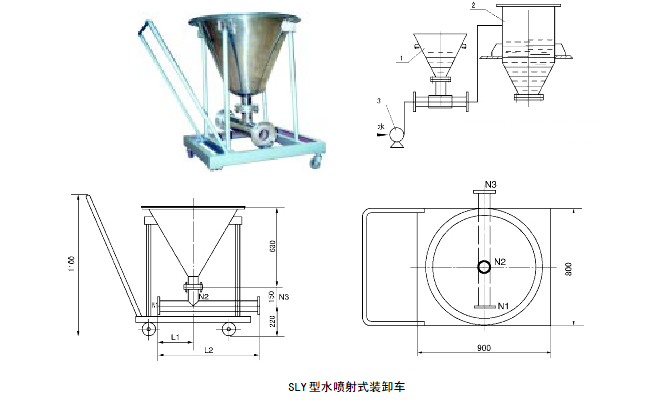 SLY型水噴射式裝卸車 概 述 SLY型水噴射式裝卸車,主要由漏斗和噴射器兩部分構成,用來裝填和補充顆粒材料。如活性碳、離子交換器用的樹脂和其它固體材料。 SLY型水噴射式裝卸車,它借助高壓水傳送可流動顆粒材料,使其通過一個漏斗進入噴射器。 水以很高的速度從動力噴嘴中噴出,進入噴射器的混合區,這時噴射的水帶動傳送物,通過一個管道或軟管導入使用現場。