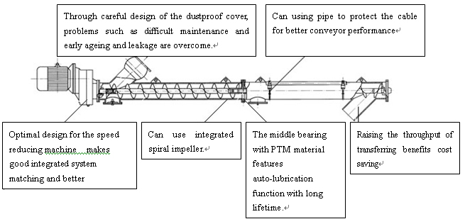 Product features --High-effective transferring: The conveyor features small diameter and high rotary speed, pitch-variable spiral body that can guarantee smooth, uniform and fast feeding. --Arbitrary arrangement: The shell of the conveyor made of stainless steel pile connected with flange features good rigid, it can transfer material at the case of horizontal plane and big declination and can be connected directly with related equipment without the need to make foundation, thus facilitating the operation of erection and movement and reducing space occupation. --Fine lubrication: By applying labyrinth seal design and special PTM less-oil lubrication sliding bush, a concentrated lubricating system consisting of the oil pump, oil distributor and piping is formed in the conveyor, thus ensuring all parts fully lubricated and expanding the lifetime of the conveyor. -- Reliable seal: Reliable lubrication seal without any leakage and waste of lubricating oil, thus creating good working environment. Through modification of the visual window, the conveyor becomes much better. Even in bad weather condition, the conveyor works well. --Multiple element connection: The inlet and outlet can be connected with universal cardan joint,cloth bag and flange. --Creative design: By importing special chain gear speed reducing machine with advanced design concept and advanced manufacturing process and QC guarantee system, the conveyor is characteristic of small volume, big bearing pitch and no oil leakage.Configuration of the system: