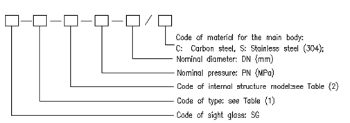 Illustration of denotation Select a single pressure flange-connected sight glass with swing-plate internal structure, nominal pressure of flange 0.6 Mpa, nominal diameter 80mm and low carbon steel main body material as an example, the denotation symbol is SG-II-P-0.6-80/C. Table 1